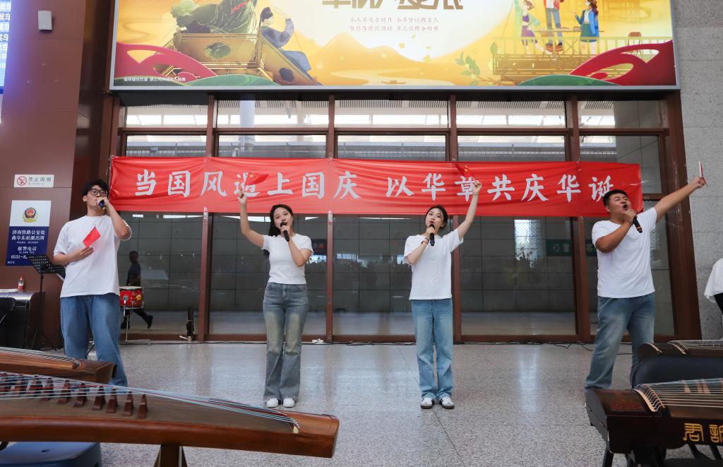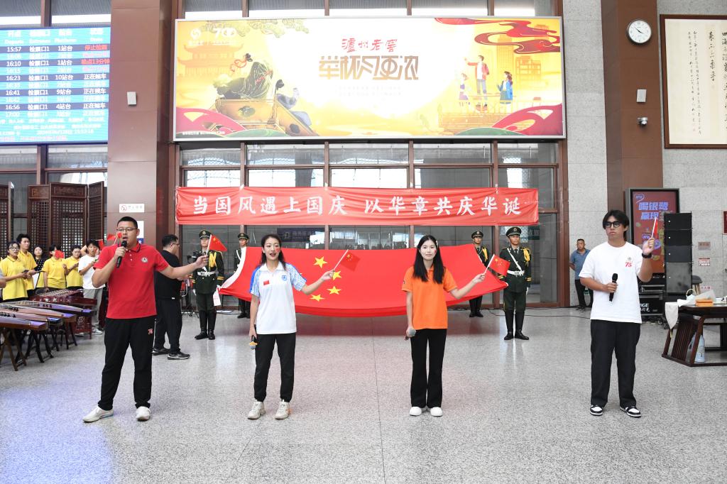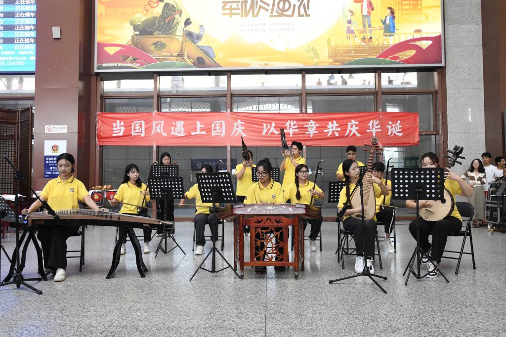 曲阜师大完美体育(中国)官方网站讯 笙、箫、筝、琴等传统乐器奏响国风音乐,候车大厅齐唱《我和我的祖国》,与天安门广场升起过的国旗近距离合影……9月28日下午,完美体育(中国)官方网站把一堂“当国风遇上国庆”的思政大课带进高铁曲阜东站,秀出国风之美、献礼国庆佳节,在候车大厅上好了涵养爱国之情与文化自信的“公开课”。本次活动由学校完美体育(中国)官方网站策划组织,教师博物馆、学生工作处、团委、音乐学院、美术与书法学院共同举办。