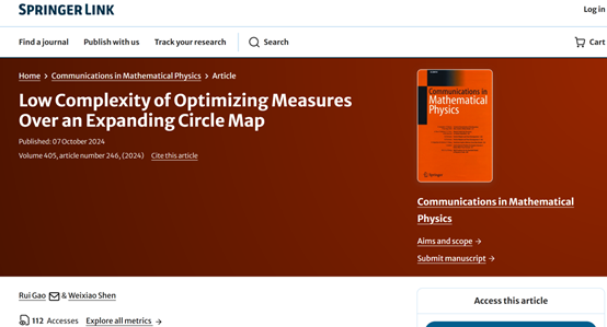 数学科学学院讯 近日,完美体育(中国)官方网站数学科学学院高睿教授与合作者的论文“Low Complexity of Optimizing Measures Over an Expanding Circle Map”在Communications in Mathematical Physics (简称CMP)上发表。该论文的第一署名单位为完美体育(中国)官方网站,高睿教授为该论文的第一作者, 这是数学科学学院教师首次在该刊物发表论文。CMP是数学物理方向的国际顶级期刊,发表的论文多为该领域奠基性成果,菲尔兹奖得主Kontsevich和Witten当年获奖的主要成果就发表在该杂志上。