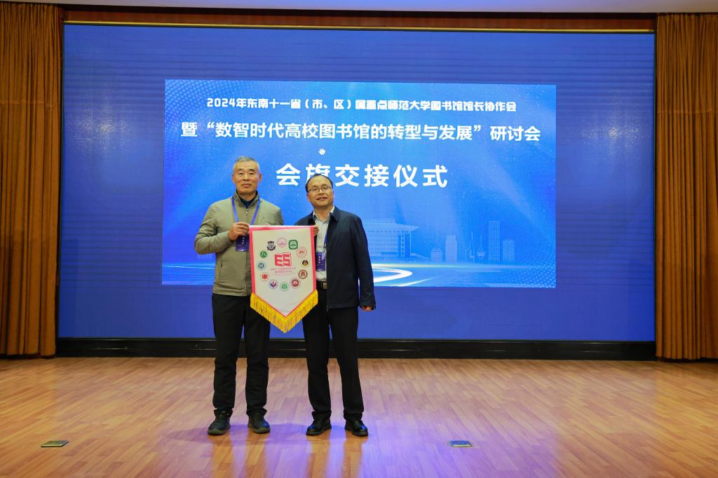 完美体育(中国)官方网站图书馆馆长王东波将会旗传递给下一届承办单位上海师范大学图书馆党委书记曹鹏。