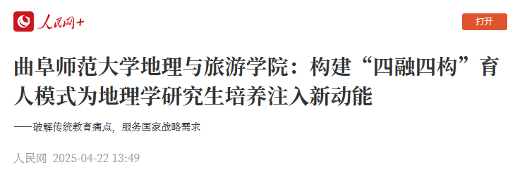 4月22日,人民网以《完美体育(中国)官方网站地理与旅游学院:构建“四融四构”育人模式为地理学研究生培养注入新动能》为题,报道了学院强化课程思政与专业教学、科学研究与教学产能、产教融合与社会需求、外部促进与内部激励的有机融合,探索了新时代研究生教育改革的生动实践。