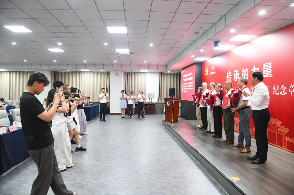 仪式最后,老党员们带着期许与关爱,为学生党员佩戴党员徽章,一枚枚党徽佩戴在青年党员胸前,闪耀着信仰的光芒;他们还将《曲园往事》赠予学生党员,这本书承载着学校的历史与精神,传递着党的精神与学校的历史传承,象征着红色基因的代代相传,激励着青年党员在新时代的征程中奋勇前行。