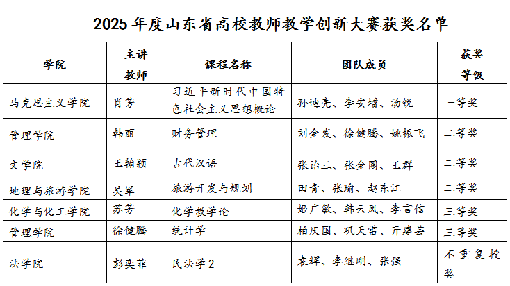 教务处讯 近日,山东省教育厅发布2025年度山东省普通高等学校教师教学创新大赛获奖名单(鲁教高函〔2025〕19 号),曲阜师大教师团队凭出色的教学创新能力和扎实的专业素养,在激烈的竞争中脱颖而出,斩获一等奖1项、二等奖3项、三等奖2肖芳教授团队代表山东省参加第五届全国教师教学创新大赛国赛的角逐