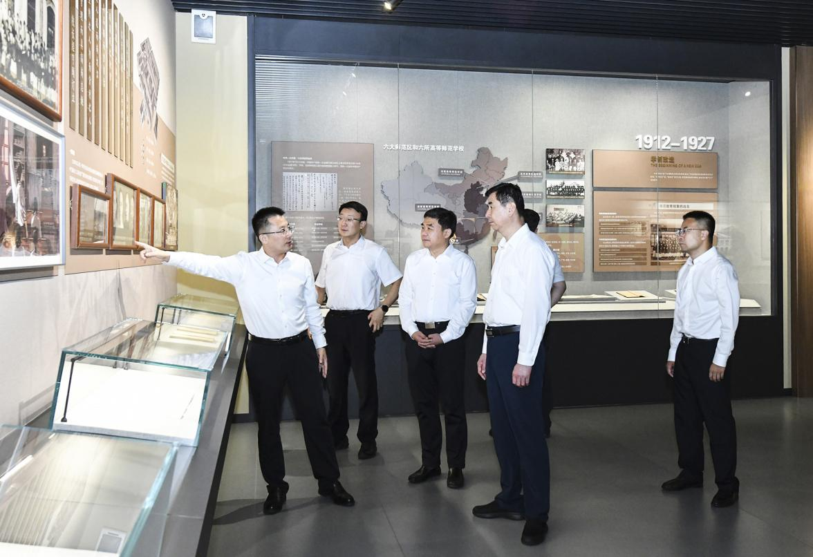 在教师博物馆,刘斯杰深入了解了博物馆在传承中华优秀教育文化、弘扬尊师重教传统、服务师德师风建设等方面发挥的独特作用。他详细询问博物馆的建设历程、功能定位、社会影响以及未来发展规划,对学校建设这一国家级特色文化教育平台表示赞赏。刘斯杰特别指出,博物馆作为教育部师德师风建设基地,不仅是彰显师范教育特色、厚植教育情怀的重要载体,更是学校教育学高峰学科建设不可或缺的优质文化资源和实践支撑平台。他期望学校继续发挥好博物馆的育人功能和文化辐射作用,将其打造成为传承师道、涵养师德、培育人才的重要阵地,为新时代教师队伍建设和教育学高峰学科发展提供坚实的文化支撑与精神动力。