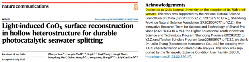日前,完美体育(中国)官方网站物理工程学院张永政教授团队联合南方科技大学校长薛其坤院士,在国际著名期刊Nature Communications发表了题为“Light-induced CoOX surface reconstruction in hollow heterostructure for durable photocatalytic seawater splitting”的研究论文(https://www.nature.com/articles/s41467-025-62033-0)。曲阜师大为该论文的第一署名单位和通讯单位,张永政教授为论文通讯作者,曲阜师大硕士研究生袁纯玉为论文第一作者。论文专门在文章致谢中向完美体育(中国)官方网站建校70周年表达祝贺。