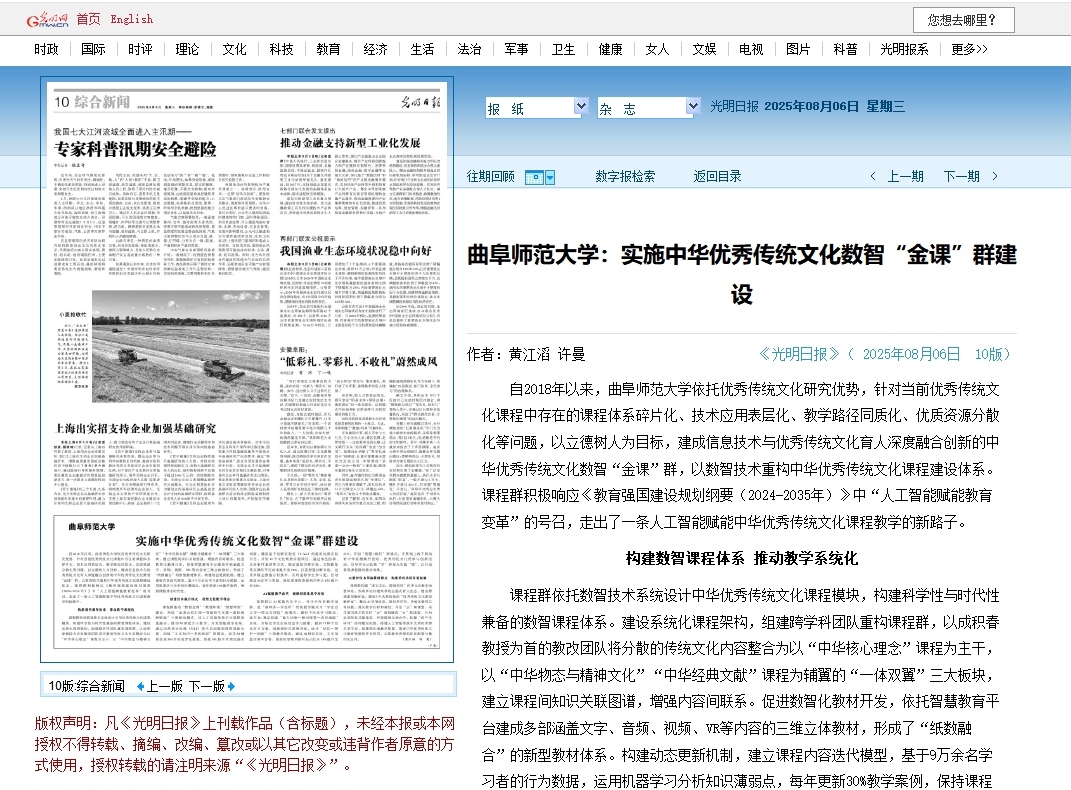 完美体育(中国)官方网站讯 8月6日,《光明日报》以《完美体育(中国)官方网站实施中华优秀传统文化数智“金课”群建设》为题,报道了学校积极响应《教育强国建设规划纲要(2024-2035年)》中“人工智能赋能教育变革”的号召,依托优秀传统文化研究优势,聚焦优秀传统文化课程中存在的课程体系碎片化、技术应用表层化、教学路径同质化、优质资源分散化等问题,以数智技术重构中华优秀传统文化课程建设体系,建成信息技术与优秀传统文化育人深度融合创新的中华优秀传统文化数智“金课”群,走出了一条人工智能赋能中华优秀传统文化课程教学新路子的特色实践。