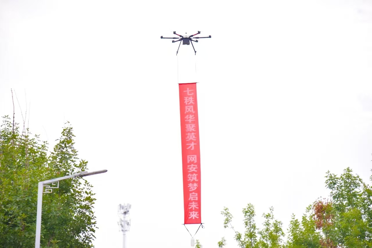 网络空间安全学院以科技为引,打造了极具辨识度的迎新场景。数架无人机搭载着色彩鲜明的迎新条幅,在校园上空灵活盘旋,“欢迎 2025 级新同学”“网安护航,未来可期” 的字样清晰呈现,让新生抬头便能捕捉到学院的诚意与期许。