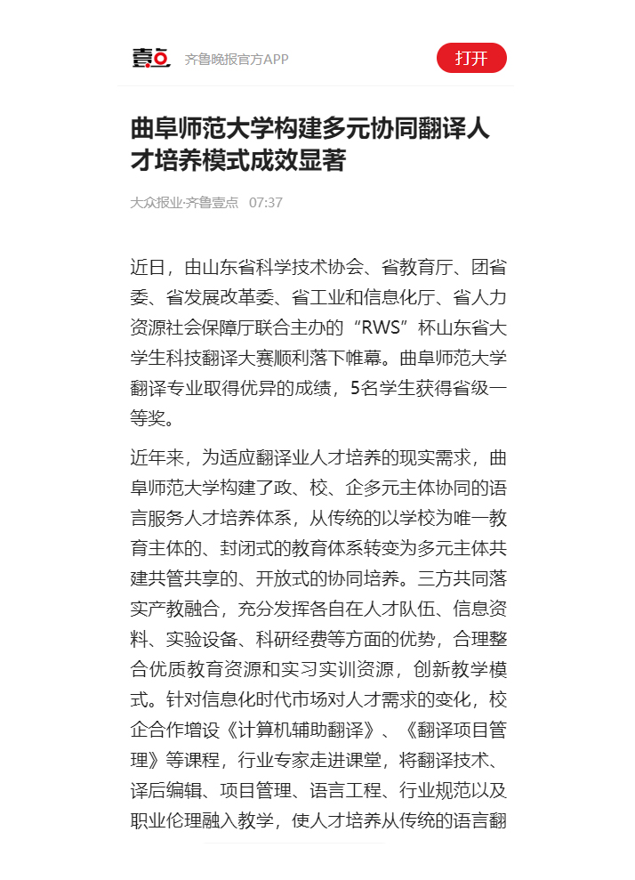 【齐鲁晚报】完美体育(中国)官方网站构建多元协同翻译人才培养模式成效显著