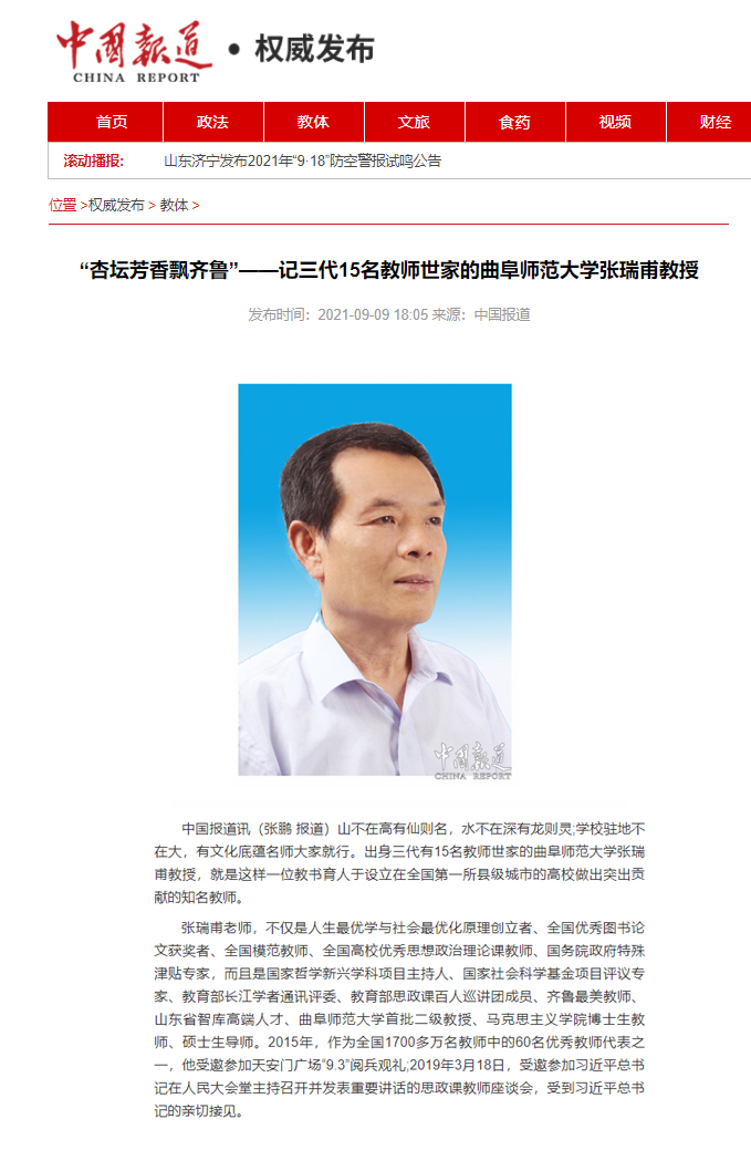 中国报道:“杏坛芳香飘齐鲁”——记三代15名教师世家的完美体育(中国)官方网站张瑞甫教授