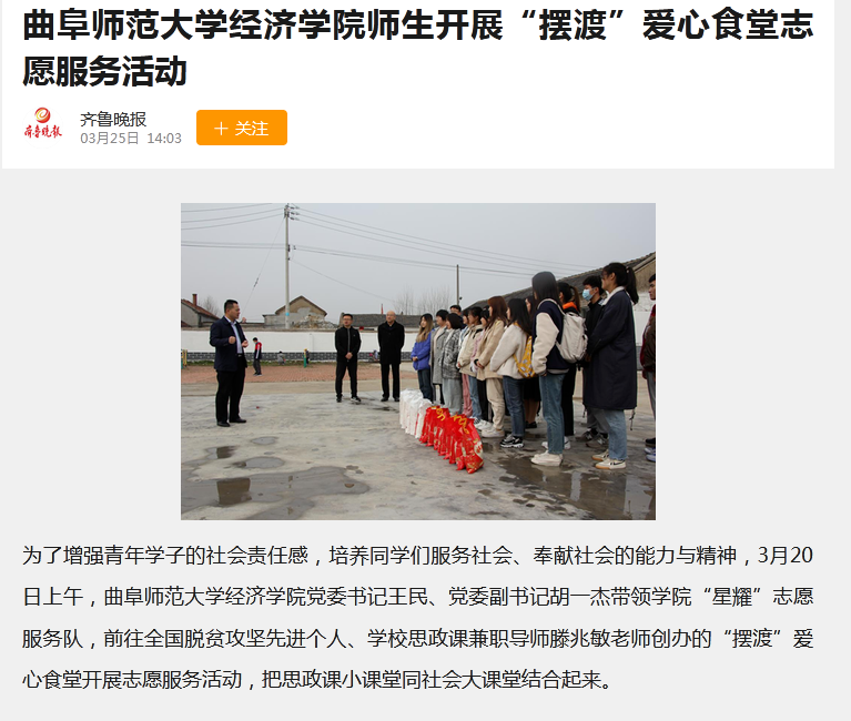 齐鲁晚报:完美体育(中国)官方网站经济学院师生开展“摆渡”爱心食堂志愿服务活动