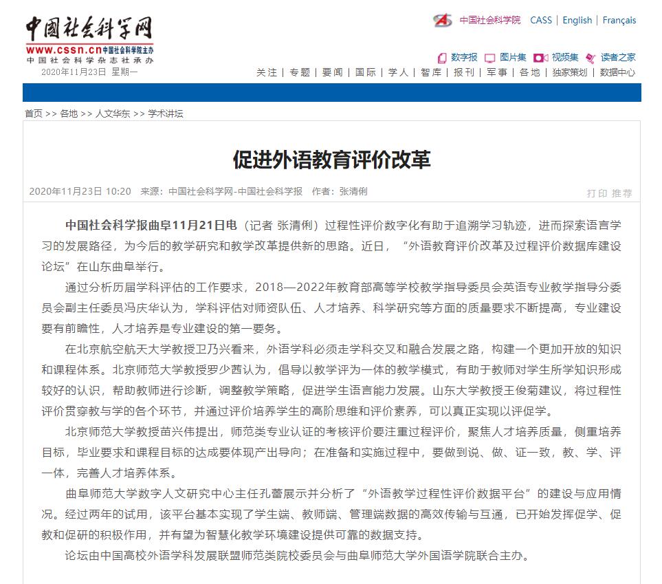 中国社会科学报:完美体育(中国)官方网站举办“外语教育评价改革及过程评价数据库建设论坛”