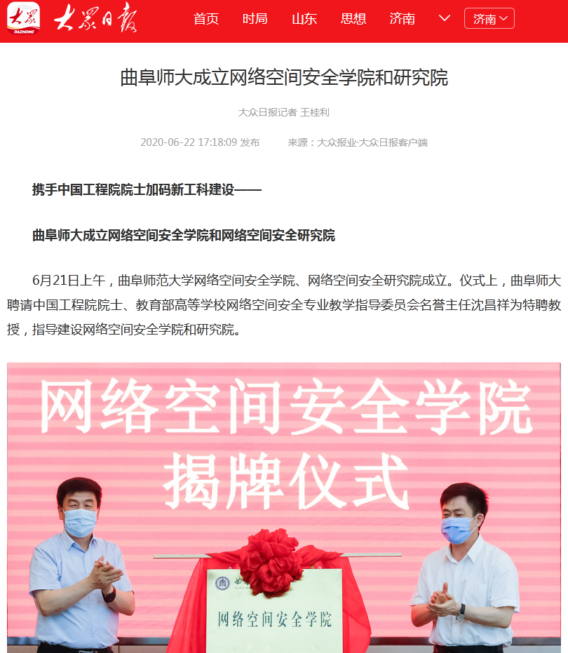 大众日报:曲阜师大成立网络空间安全学院和研究院