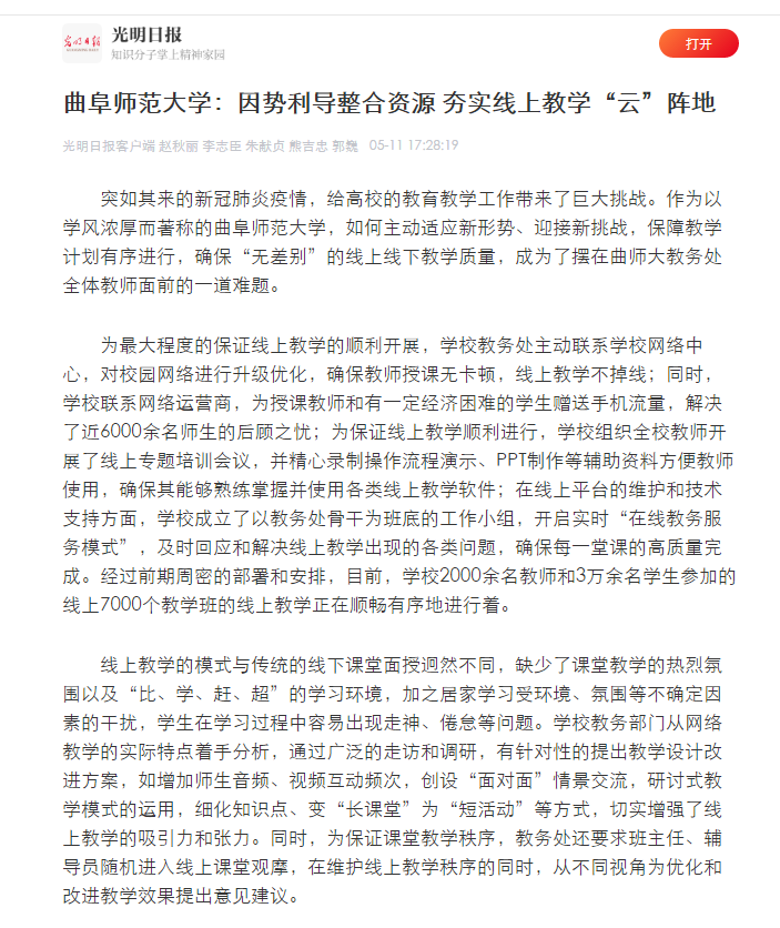 光明日报:完美体育(中国)官方网站因势利导整合资源 夯实线上教学“云”阵地