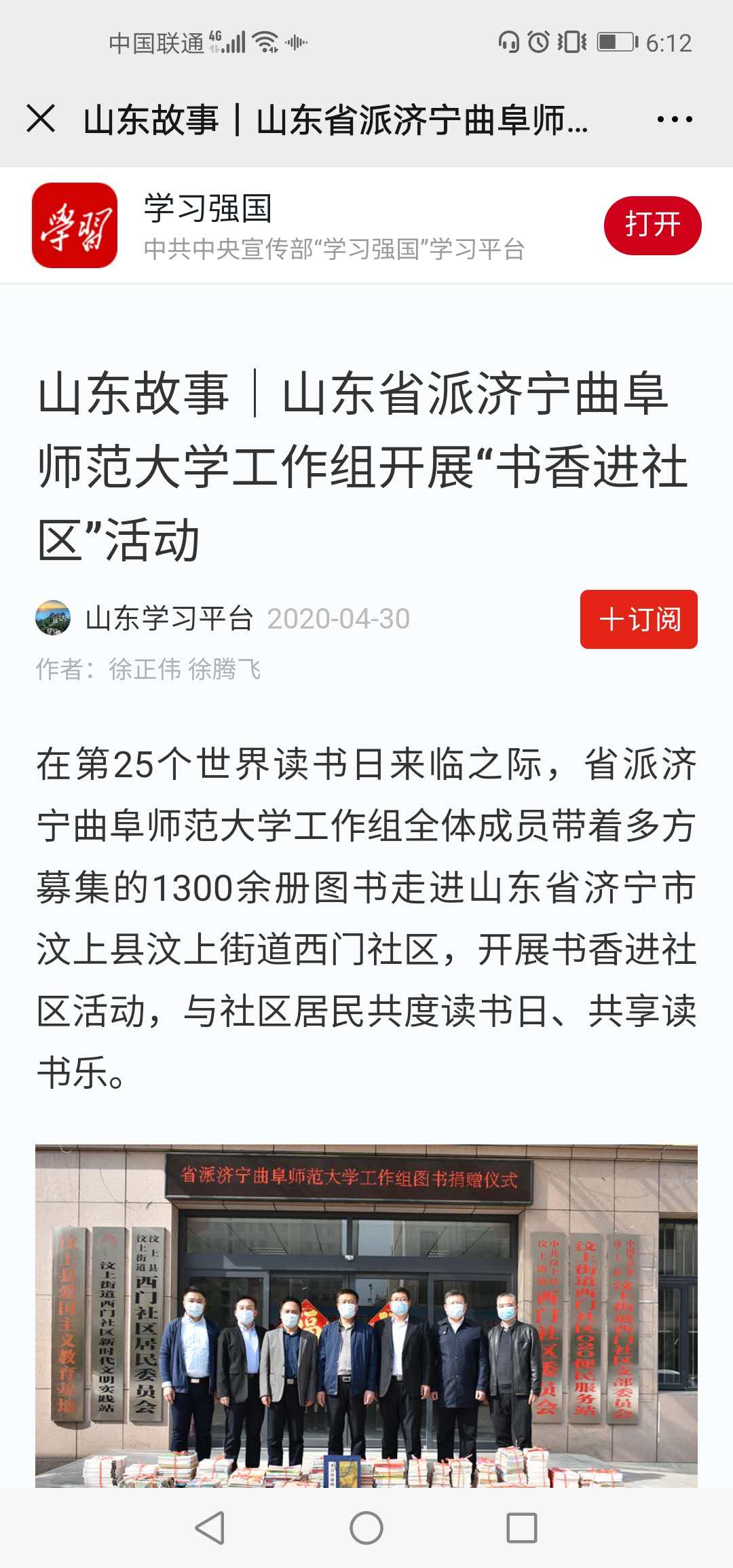 学习强国:山东省派济宁完美体育(中国)官方网站工作组开展“书香进社区”活动