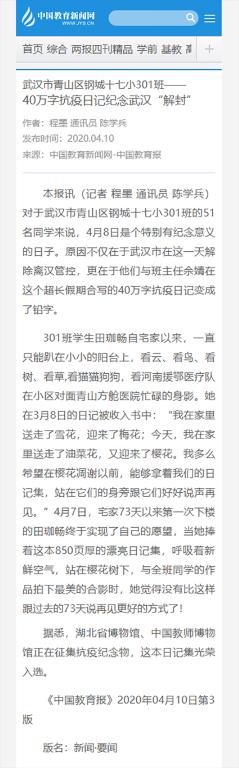 中国教育报:40万字抗疫日记纪念武汉“解封”入选教师博物馆