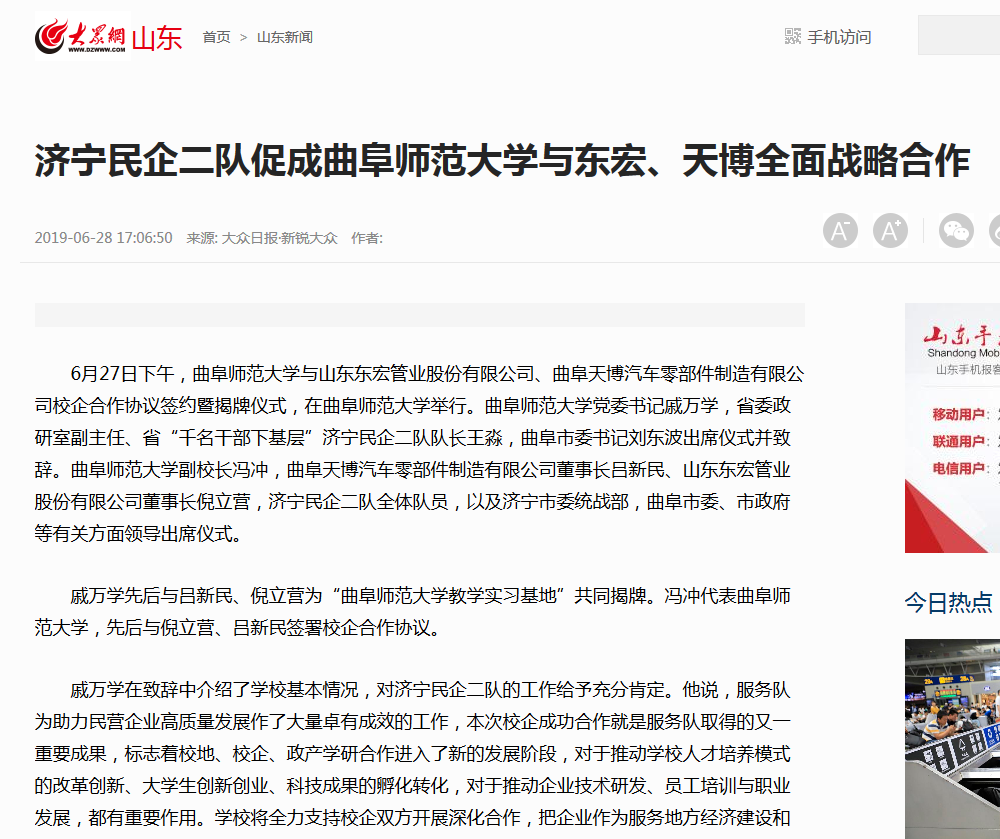 大众网:完美体育(中国)官方网站与东宏、天博达成全面战略合作