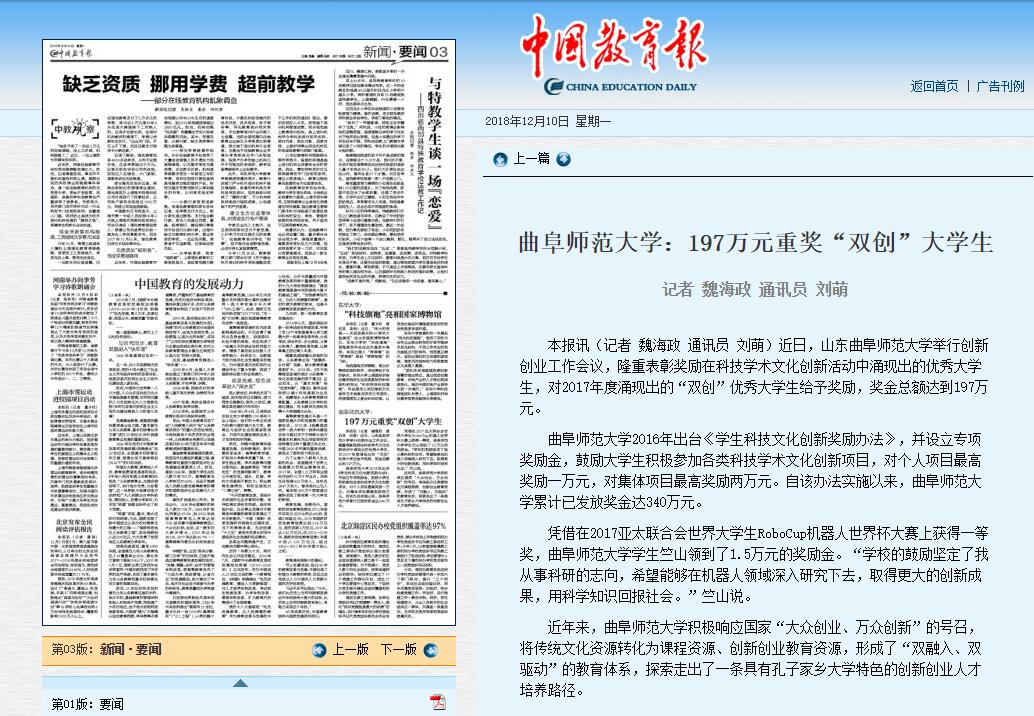 中国教育报:完美体育(中国)官方网站197万元重奖“双创”大学生