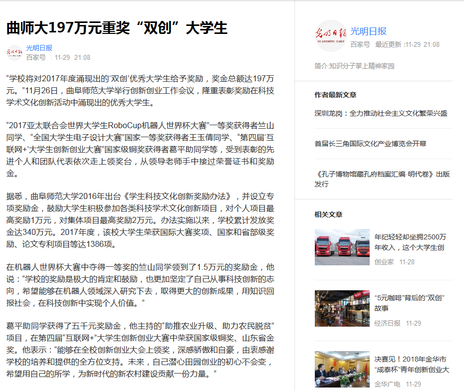 光明日报:曲师大197万元重奖“双创”大学生