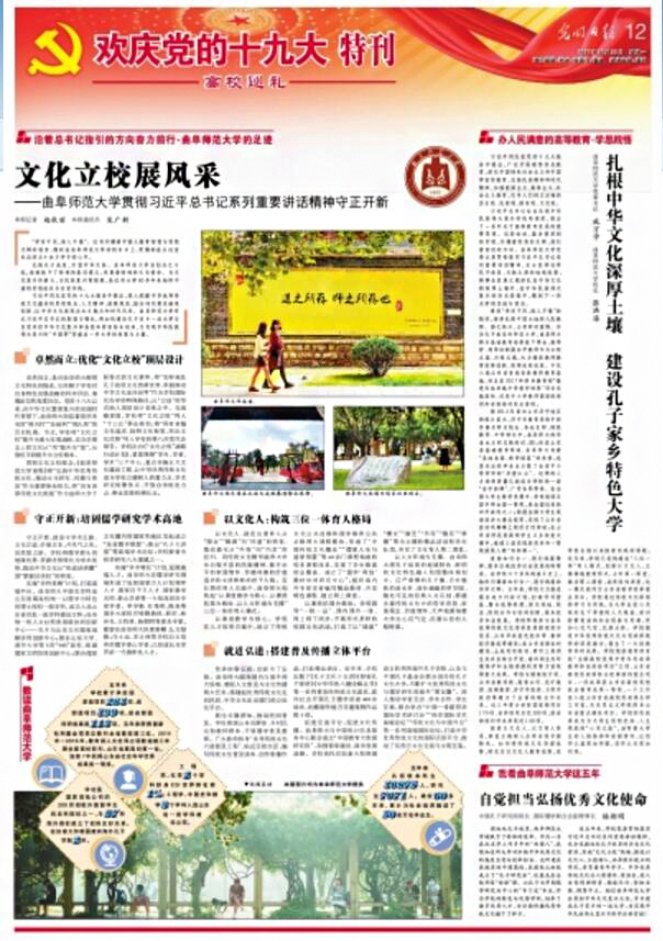 在党的十九大隆重召开期间,10月23日,《光明日报》“欢庆党的十九大特刊·高校巡礼”推出完美体育(中国)官方网站专版,详细报道了完美体育(中国)官方网站深入学习贯彻习近平总书记系列重要讲话精神、加快建设孔子家乡一流大学的生动实践与系列成就。