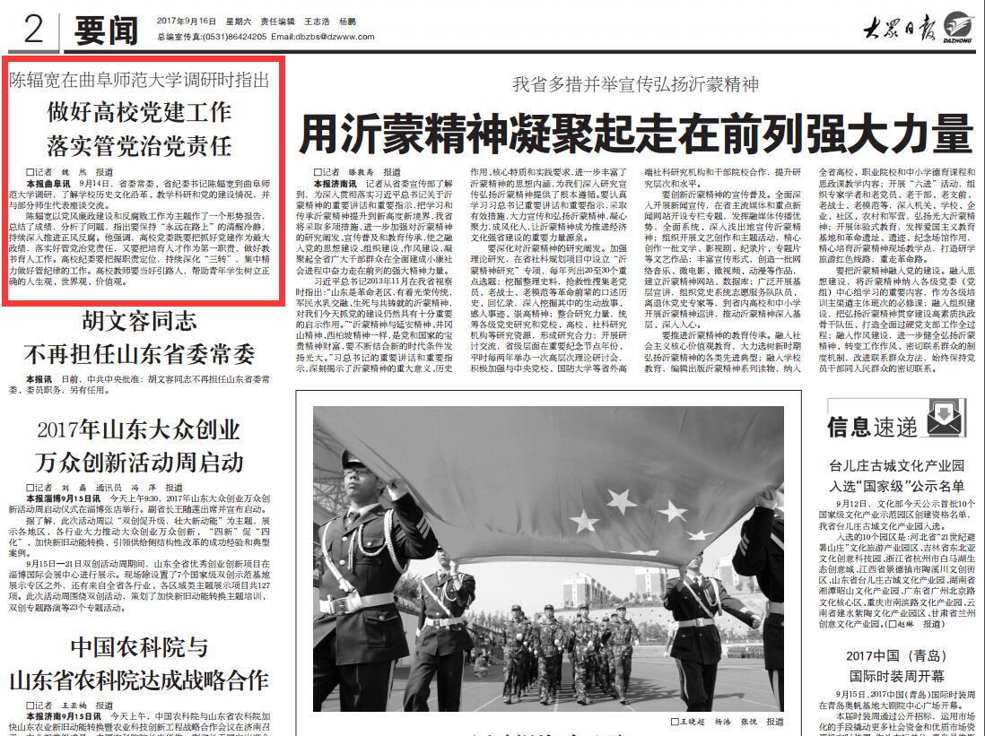 《大众日报》:省委常委、省纪委书记陈辐宽到曲师大调研并与师生代表座谈交流