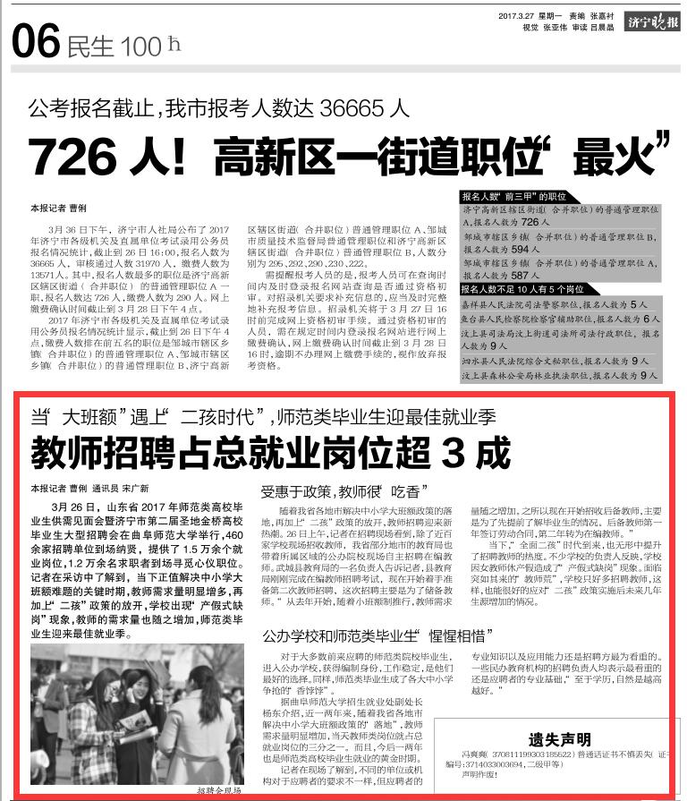 济宁晚报:师范类毕业生迎最佳就业季