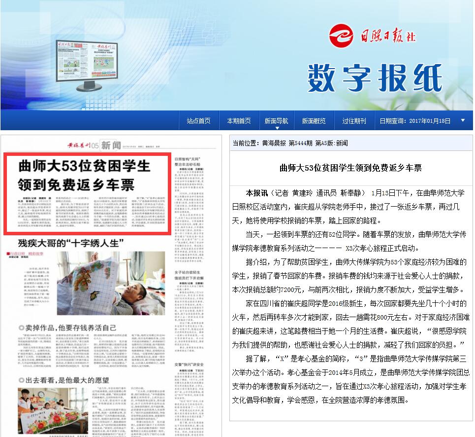 黄海晨刊:曲师大53位贫困学生领到免费返乡车票