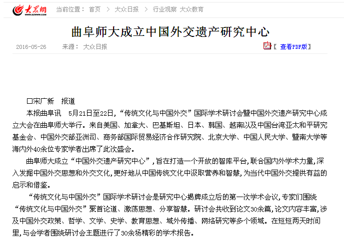大众日报:曲阜师大成立中国外交遗产研究中心