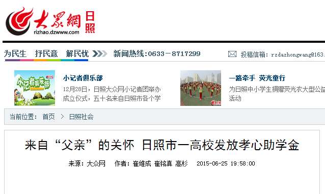 大众网:来自“父亲”的关怀 日照市一高校发放孝心助学金