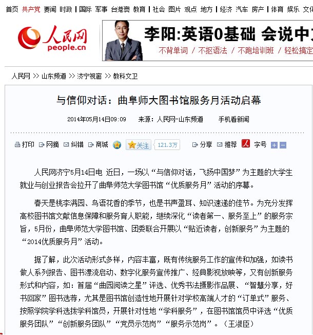 人民网:与信仰对话:曲阜师大图书馆服务月活动启幕