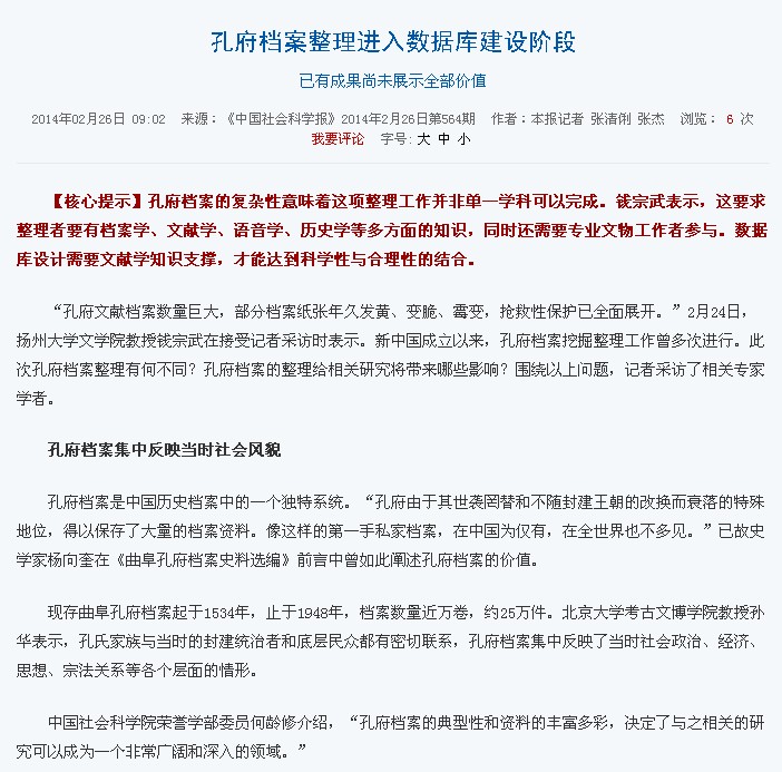 中国社会科学报:孔府档案整理进入数据库建设阶段