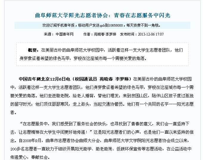 中国青年网:完美体育(中国)官方网站阳光志愿者协会:青春在志愿服务中闪光