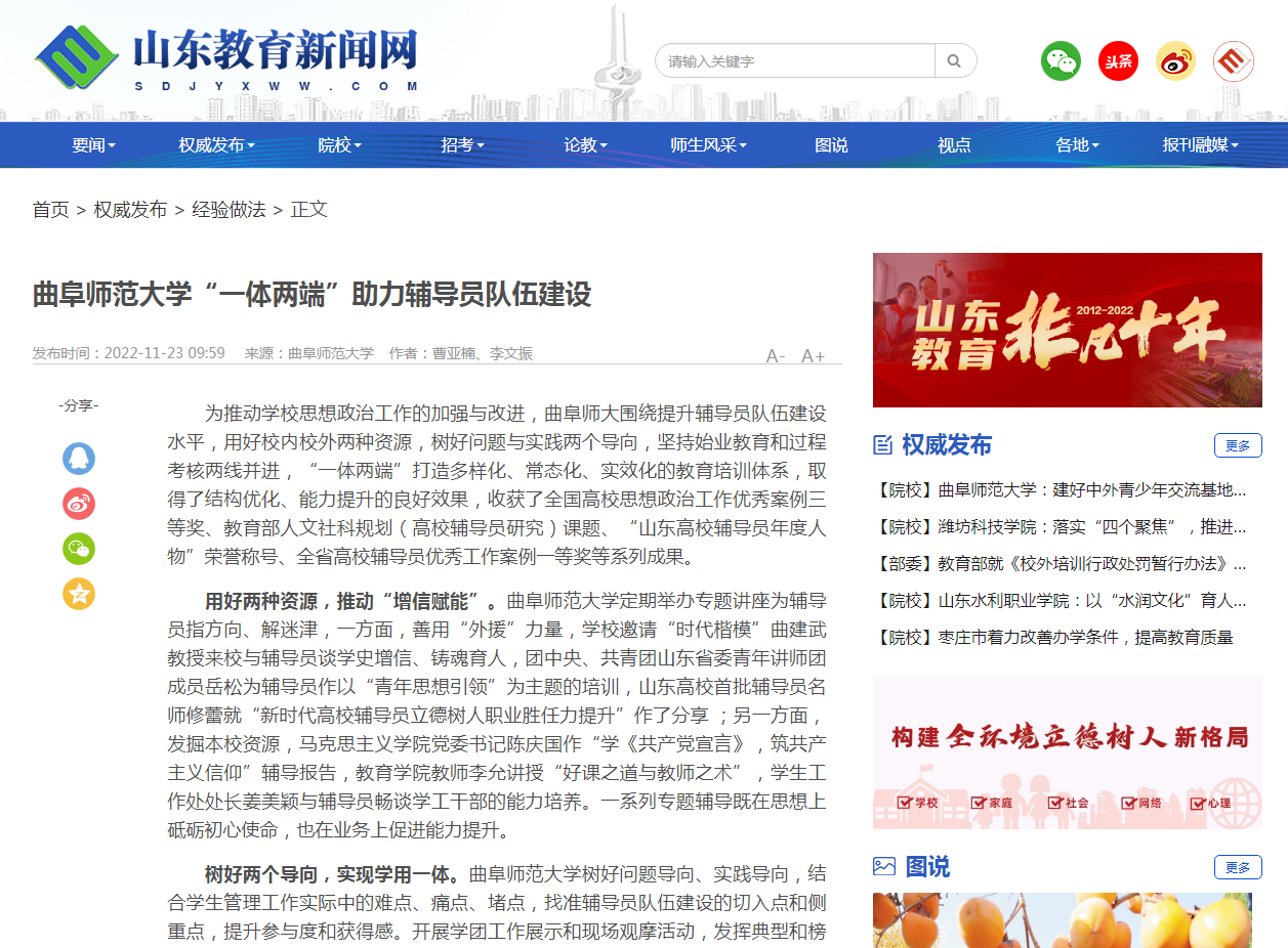 【山东教育新闻网】完美体育(中国)官方网站“一体两端”助力辅导员队伍建设
