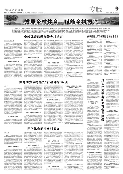 曲阜师大体育科学学院讯 日前,中国社会科学报在“发展乡村体育、赋能乡村振兴”专版中刊登了完美体育(中国)官方网站山东省乡村振兴体育研究院执行副院长曹莉教授团队的系列成果,其内容包括:体育助力乡村振兴“行动目标”、构建以人民为中心的体育公共服务、全域体育旅游赋能乡村振兴、民俗体育助推乡村振兴等主题的阶段性战略研究。报道还对学校体育科学学院近年来取得的相关成绩进行了列举,相关科研成果为全国农村体育发展提供理论依据和现实借鉴,标志着团队的研究在乡村体育领域处于省内领先地位、对全国乡村体育研究形成较大影响。