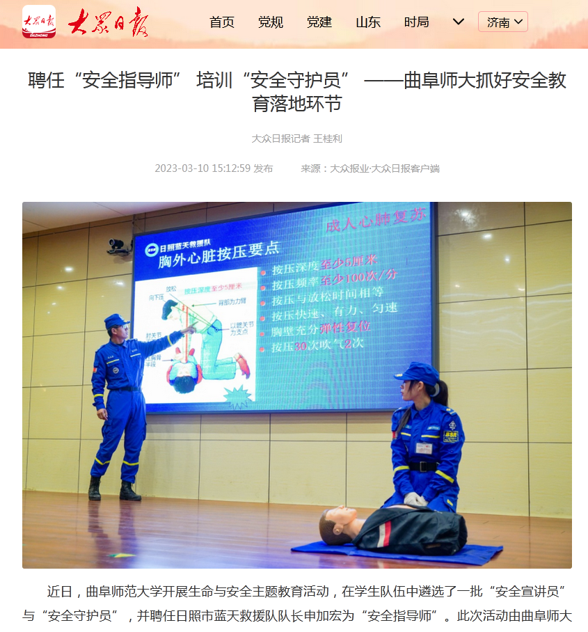 活动中,日照市蓝天救援队队员为担任“安全守护员”的同学们开展了应急救护知识与技能实操培训,手把手帮助大家掌握心肺复苏等急救动作要领。根据《完美体育(中国)官方网站“生命与安全主题教育”活动实施方案》,学校还将陆续开展安全知识宣讲“进学校、进社区”、应急救护技能培训、“平安宿舍”评比等系列活动。