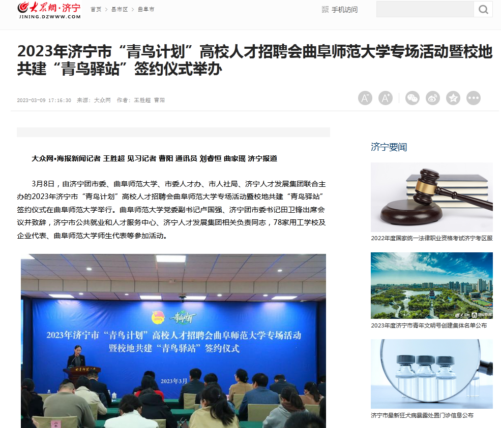 【大众网】2023年济宁市“青鸟计划”高校人才招聘会完美体育(中国)官方网站专场活动暨校地共建“青鸟驿站”签约仪式举办