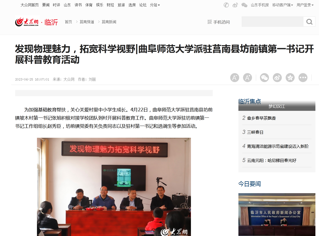 【大众网】完美体育(中国)官方网站派驻莒南县坊前镇第一书记开展科普教育活动