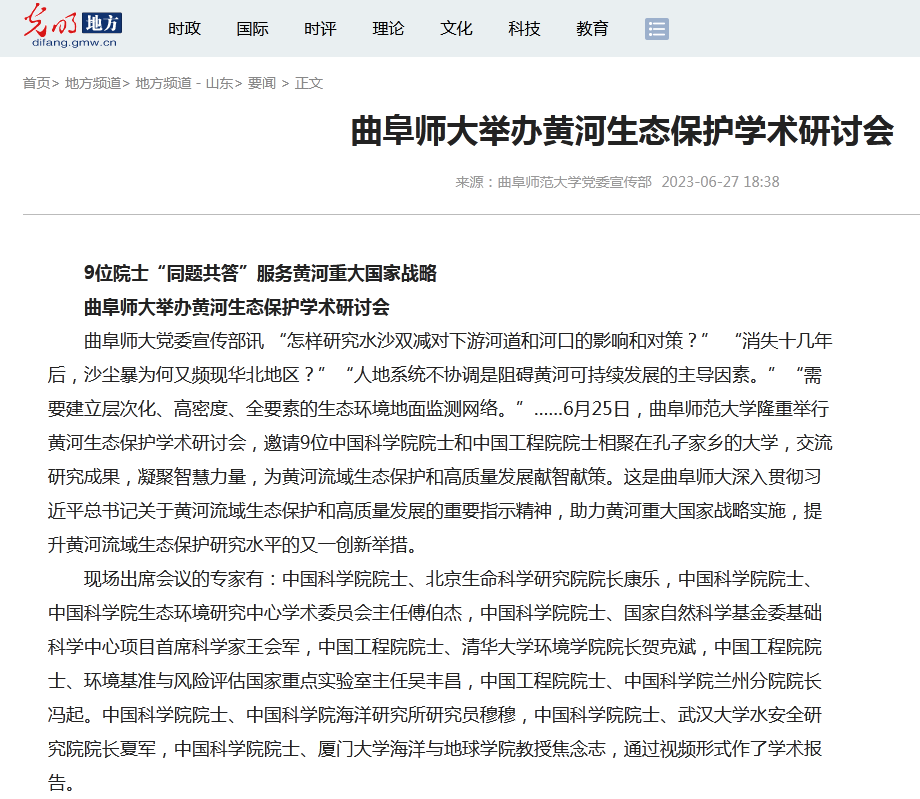 【光明网】9位院士“同题共答”服务黄河重大国家战略 曲阜师大举办黄河生态保护学术研讨会