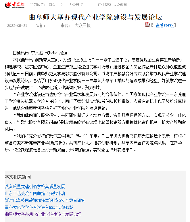 【大众日报】曲阜师大举办现代产业学院建设与发展论坛