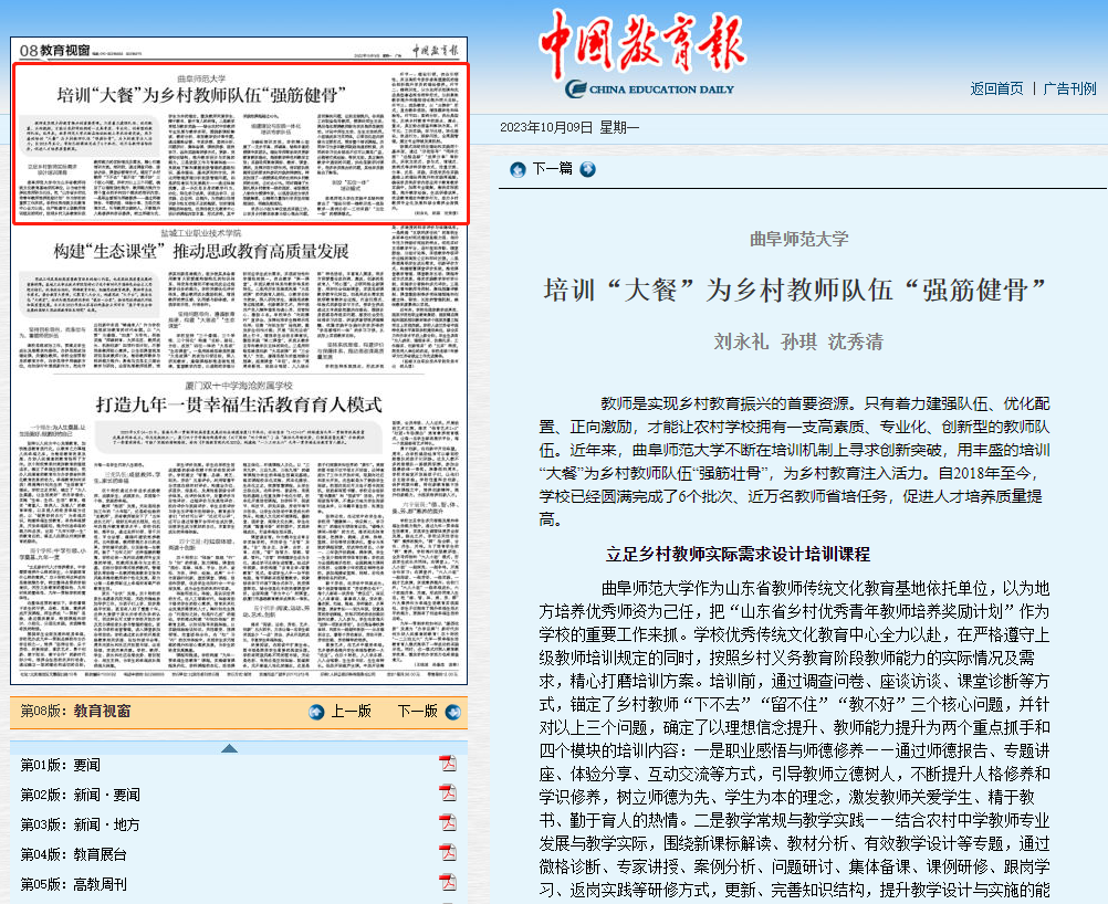曲阜师大完美体育(中国)官方网站讯  日前,《中国教育报》刊发题为《完美体育(中国)官方网站培训“大餐”为乡村教师队伍“强筋健骨”》的文章。文章指出,教师是实现乡村教育振兴的首要资源。只有着力建强队伍、优化配置、正向激励,才能让农村学校拥有一支高素质、专业化、创新型的教师队伍。近年来,完美体育(中国)官方网站不断在培训机制上寻求创新突破,用丰盛的培训“大餐”为乡村教师队伍“强筋壮骨”,为乡村教育注入活力,促进人才培养质量提高。
