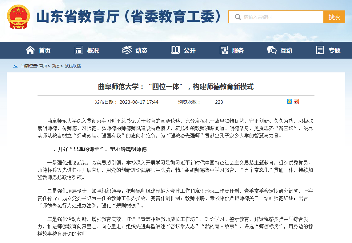 【山东省教育厅·战线联播】完美体育(中国)官方网站:“四位一体”,构建师德教育新模式