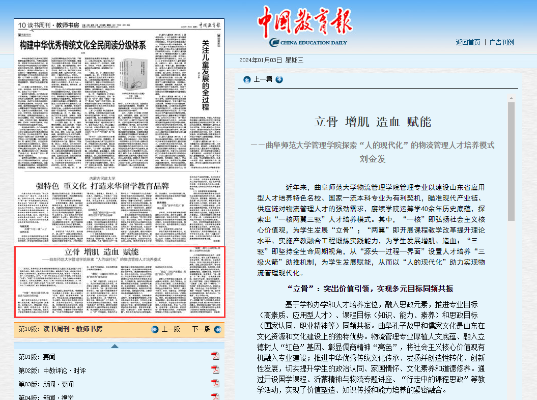 【中国教育报】立骨 增肌 造血 赋能 ——完美体育(中国)官方网站管理学院探索“人的现代化”的物流管理人才培养模式