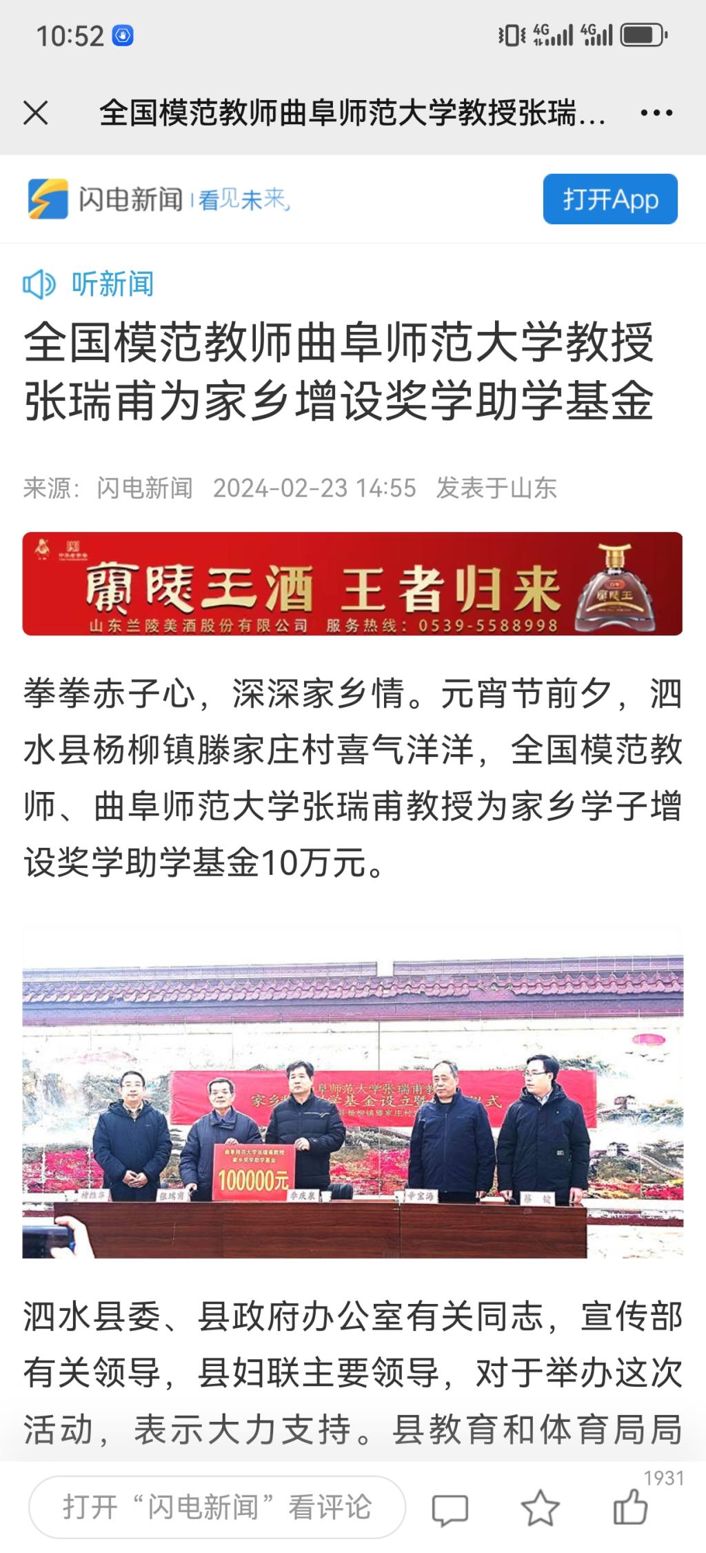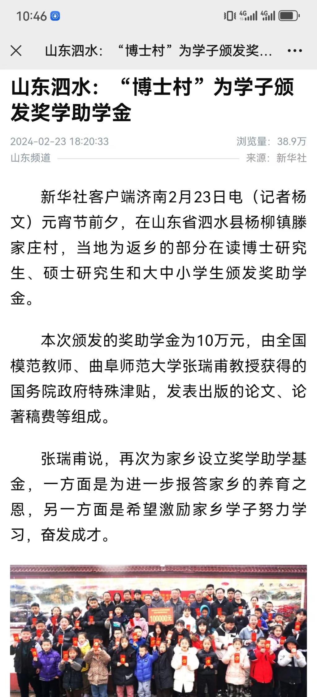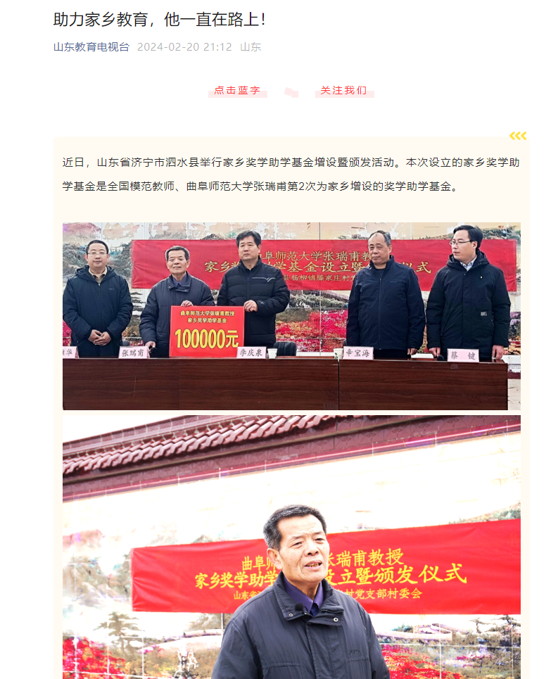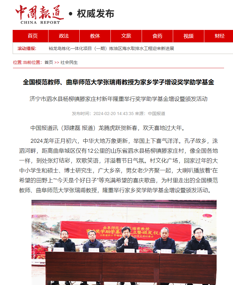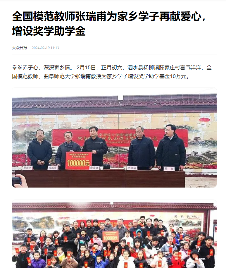 【新华社】全国模范教师、完美体育(中国)官方网站张瑞甫教授为家乡学子增设奖学助学基金