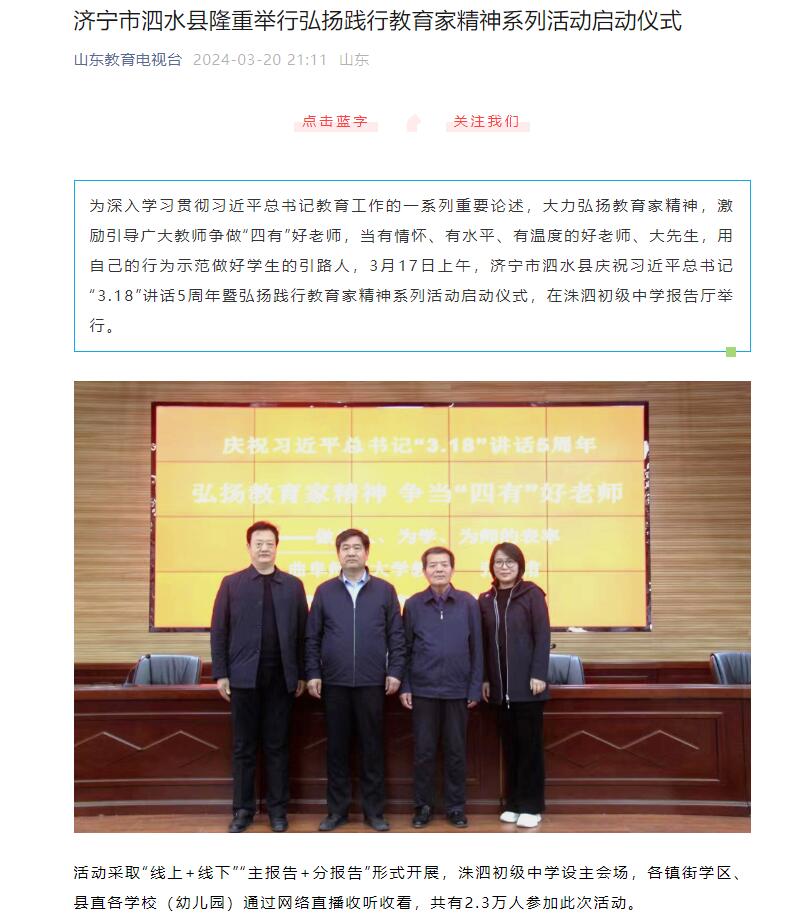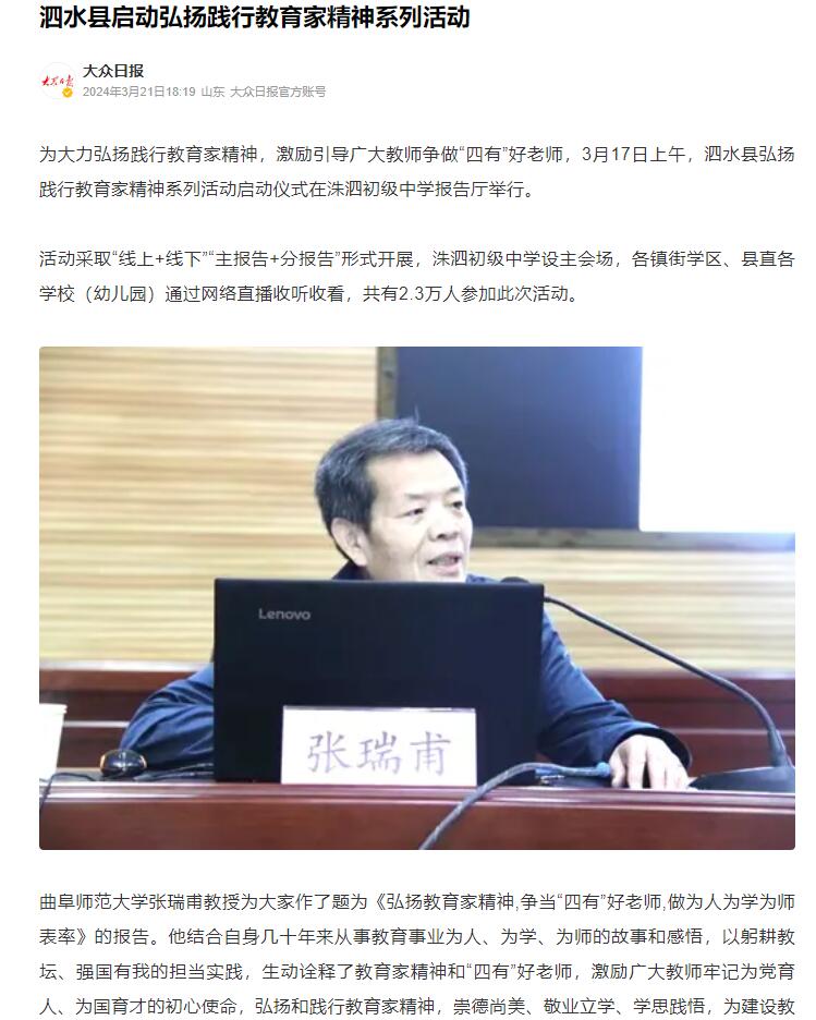 【大众日报】曲阜师大张瑞甫教授作弘扬践行教育家精神报告