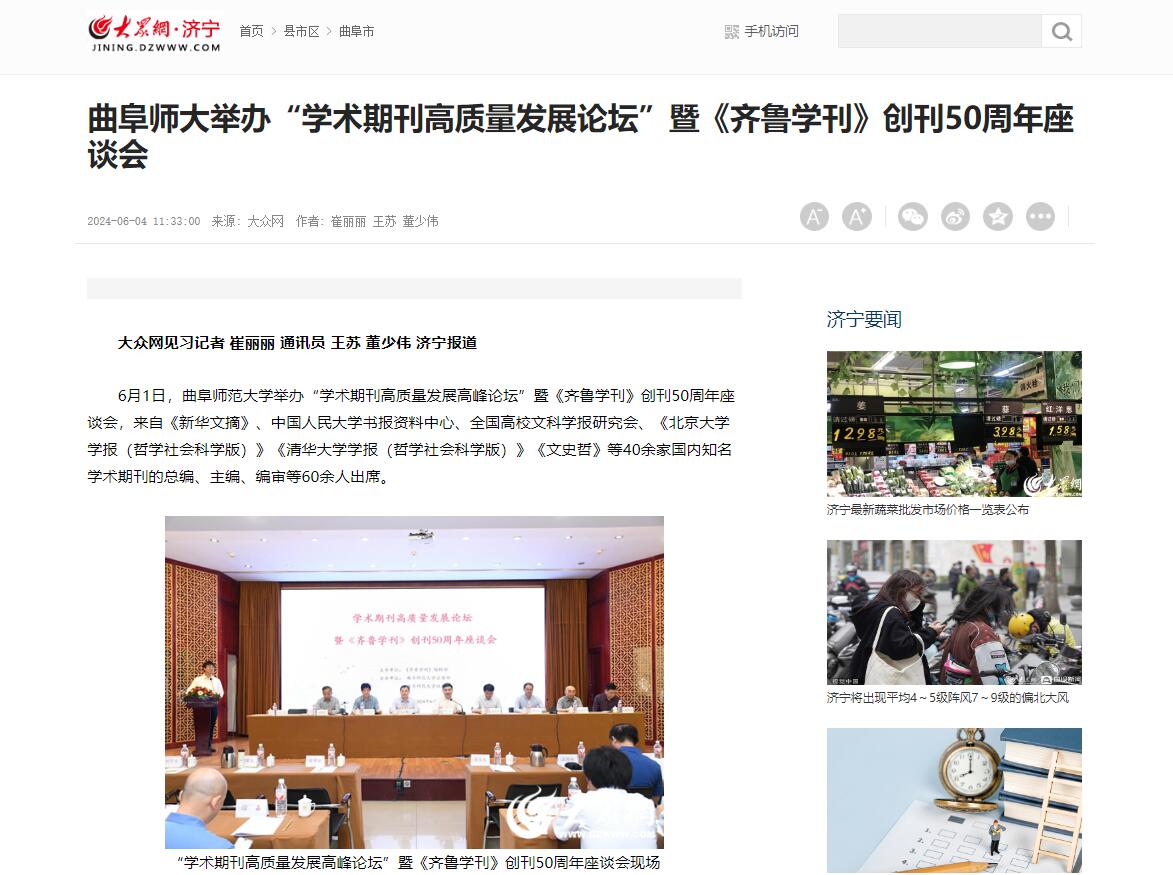 【大众网】曲阜师大举办“学术期刊高质量发展论坛”暨《齐鲁学刊》创刊50周年座谈会