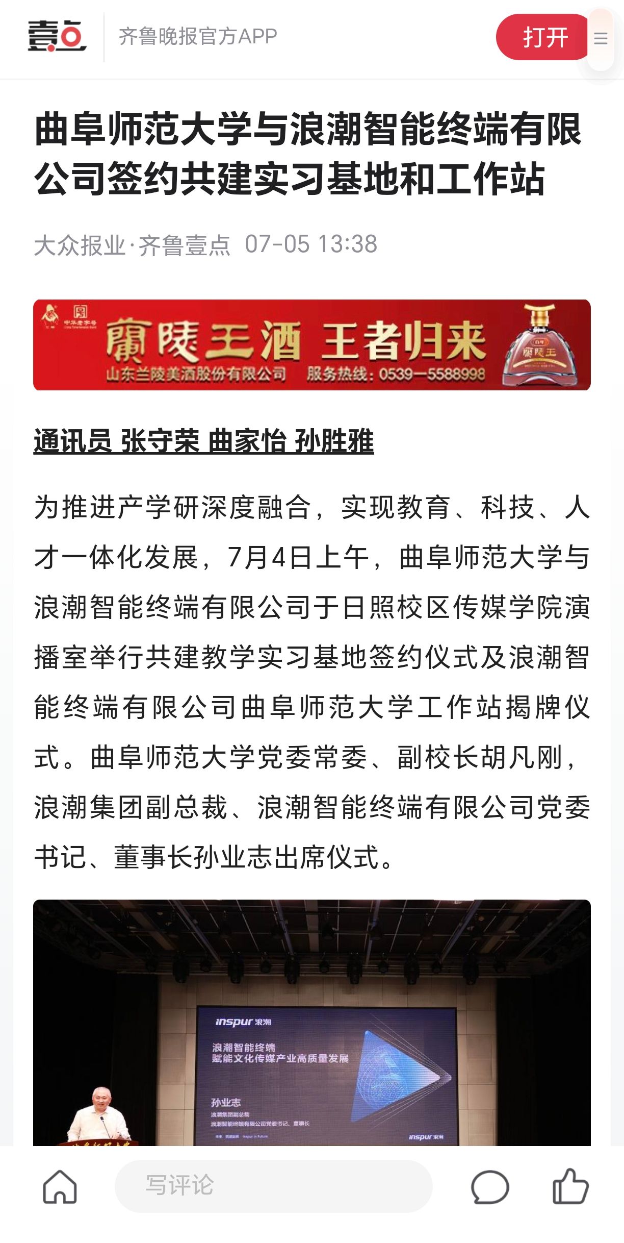 【齐鲁晚报·齐鲁壹点】完美体育(中国)官方网站与浪潮智能终端有限公司签约共建实习基地和工作站