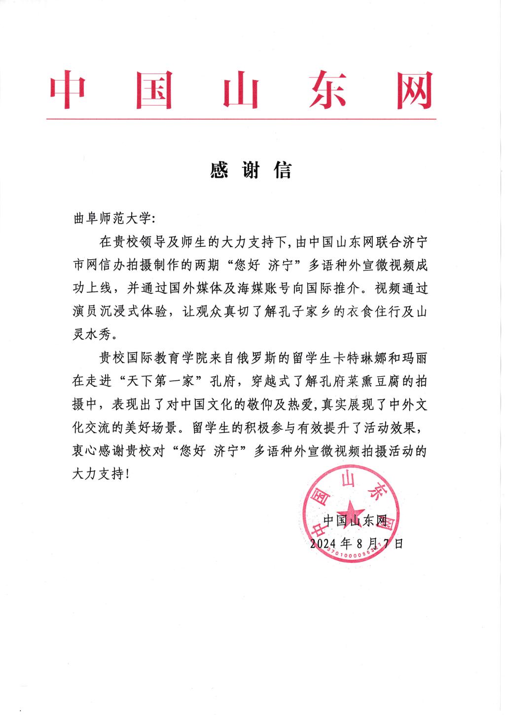 为让全球观众更深入了解济宁、爱上济宁,增强济宁的国际影响力和知名度,中国山东网济宁与济宁市委网信办共同策划《您好!济宁》双语外宣微纪录片,从衣、食、住、行以及山灵水秀等方面,用视频、动漫或AI等展现形式向观众呈现一个真实、立体、生动的孔子家乡。曲阜师大国际学生玛丽(音译)、卡特琳娜(音译)参与部分录制工作。