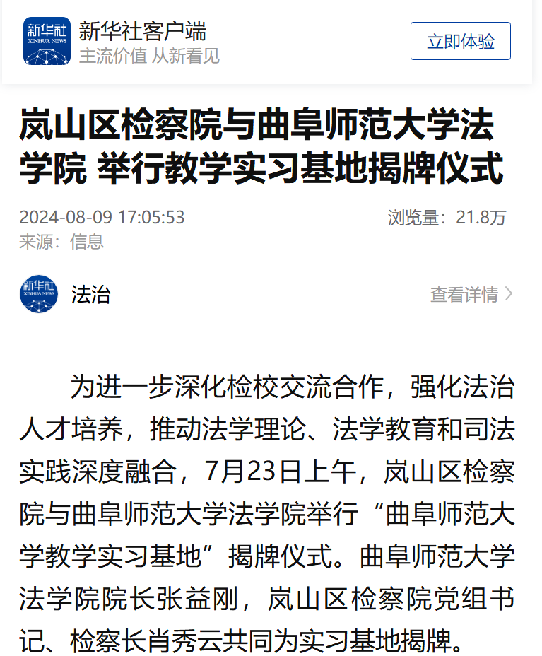 【新华社客户端】岚山区检察院与完美体育(中国)官方网站法学院举行教学实习基地揭牌仪式