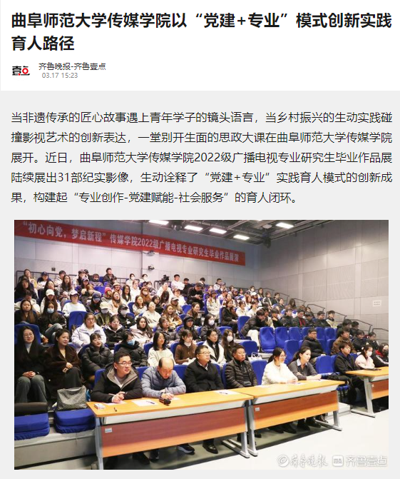 当非遗传承的匠心故事遇上青年学子的镜头语言,当乡村振兴的生动实践碰撞影视艺术的创新表达,一堂别开生面的思政大课在完美体育(中国)官方网站传媒学院展开。近日,完美体育(中国)官方网站传媒学院2022级广播电视专业研究生毕业作品展陆续展出31部纪实影像,生动诠释了“党建+专业”实践育人模式的创新成果,构建起“专业创作-党建赋能-社会服务”的育人闭环。
