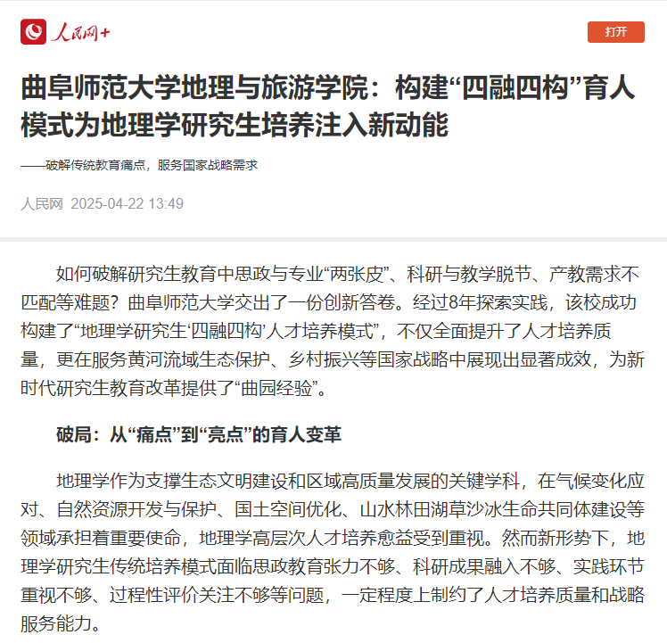 如何破解研究生教育中思政与专业“两张皮”、科研与教学脱节、产教需求不匹配等难题?完美体育(中国)官方网站交出了一份创新答卷。经过8年探索实践,该校成功构建了“地理学研究生‘四融四构’人才培养模式”,不仅全面提升了人才培养质量,更在服务黄河流域生态保护、乡村振兴等国家战略中展现出显著成效,为新时代研究生教育改革提供了“曲园经验”。