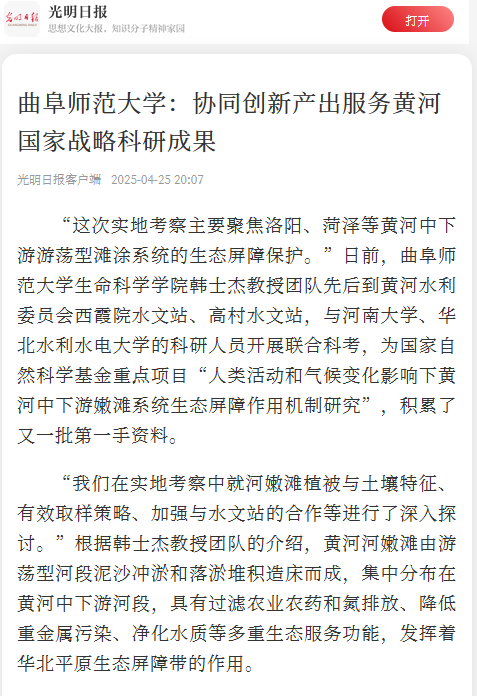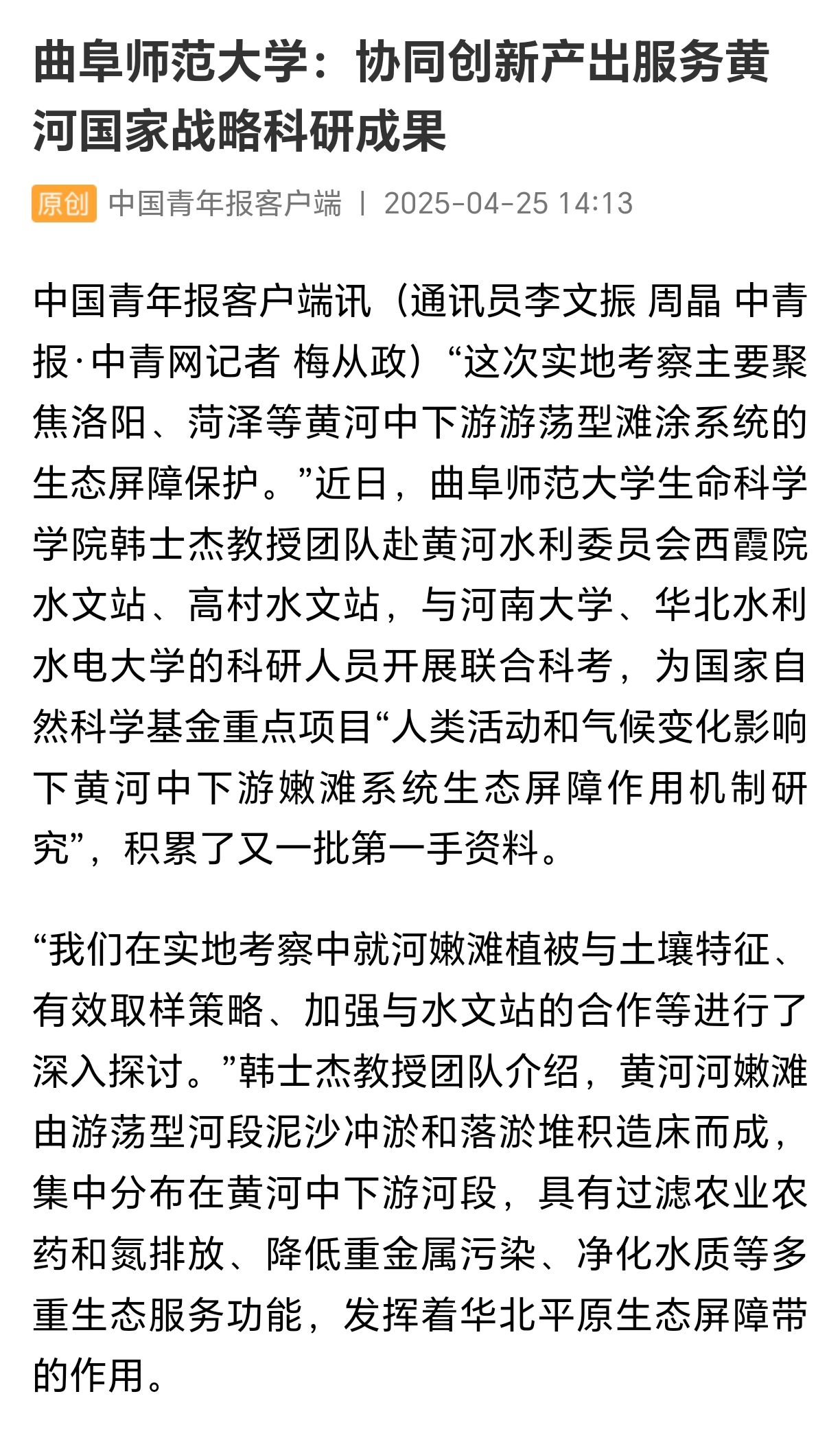 近年来,完美体育(中国)官方网站专门出台了服务黄河重大国家战略的实施方案,以顶层设计引领有组织科研,建好用好服务黄河战略学科集群,聚力开展动物生态与保育、植物生态与种质资源利用、生态修复与治理、湿地生态与保护等课题研究,打造了以张洪海教授为学术带头人的“黄河流域湿地生态与生物多样性保育协同创新中心”和“黄河流域生态保护与高质量发展智库中心”等科研平台,培育了国家自然科学基金重点项目、山东省科学技术奖等标志性成果,与黄河水利委员会黄河水利科学研究院、山东黄河三角洲国家级自然保护区管委会等深化合作共建,探索了强化协同创新、服务“国之大者”的生动实践。