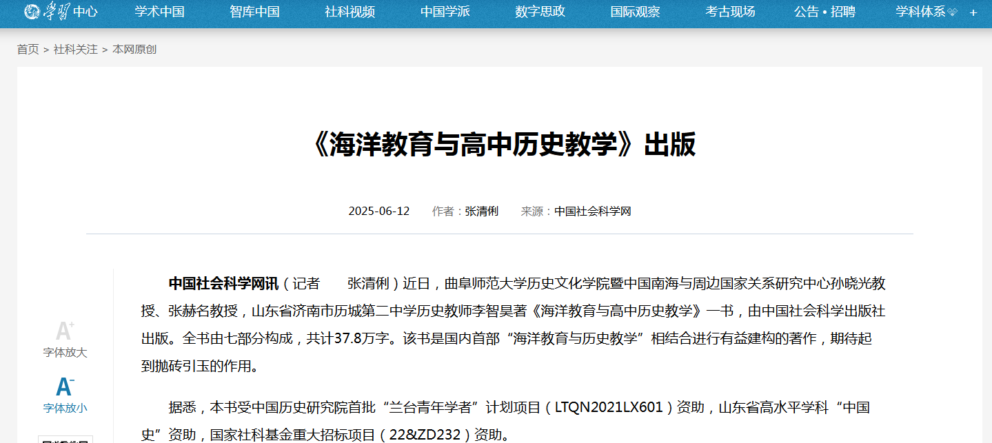 中国社会科学网讯(记者 张清俐)近日,完美体育(中国)官方网站历史文化学院暨中国南海与周边国家关系研究中心孙晓光教授、张赫名教授,山东省济南市历城第二中学历史教师李智昊著《海洋教育与高中历史教学》一书,由中国社会科学出版社出版。全书由七部分构成,共计37.8万字。该书是国内首部“海洋教育与历史教学”相结合进行有益建构的著作,期待起到抛砖引玉的作用。